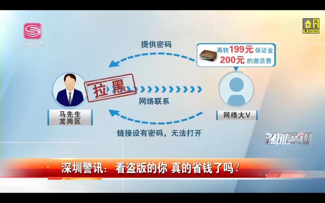 近期,龙岗区的马先生在网上联系到一个网络大V,对方称有某热播剧资源,只要28元就可以给其发下载链接。马先生觉得很划算,马上转了账,但收到的链接因设有密码还是无法打开。对方称需要再转199元保证金及200元的激活费用才能提供密码,并称这两笔钱在打开视频后可退。但当其完成转账后,却发现已被对方拉黑。