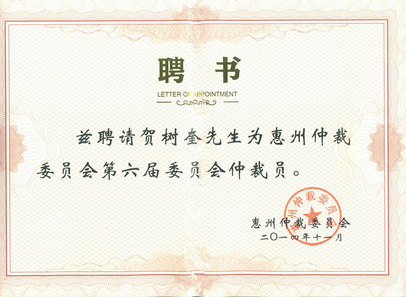 本所贺树奎律师继2012年作为惠州市外广东省内专业人士获聘为惠州仲裁委员会第五届委员会仲裁员,今年继续获聘担任惠州仲裁委员会第六届委员会仲裁员。