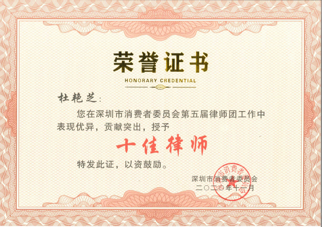 11月30日,我所合伙人杜艳芝律师因在第五届深圳市消费会律师团工作中贡献突出,被深圳市消费者委员会授予“十佳律师”称号。深圳消委会律师团充分发挥律师专业优势和积极作用,致力于消费领域的法律服务以及消费维权、相关立法、公益诉讼等项目的法律服务工作,为维护消费者合法权益、维护社会和谐稳定和促进经济市场健康发展起到了重要作用。