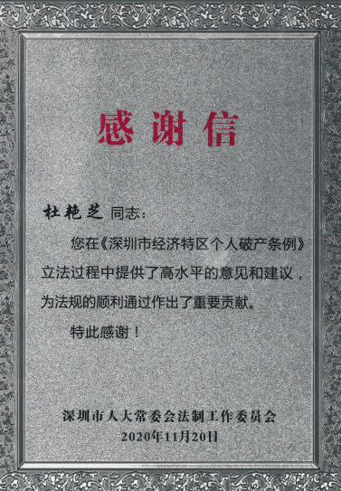 近日,我所合伙人杜艳芝律师收到深圳市人大常委会法制工作委员会发出的《感谢信》,对杜艳芝律师在《深圳经济特区个人破产条例》立法过程中提供的高水平意见和建议给予充分肯定。《深圳经济特区个人破产条例》经市第六届人民代表大会常务委员会第四十四次会议于2020年8月26日通过,自2021年3月1日起施行。